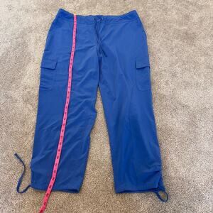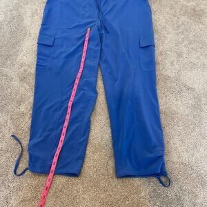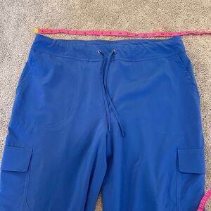All orders ship within 1-3 business days. These womens athletic jogger pants are made by Chicos. Color is a sky blue. Size is 1 (or a women's 8 medium). Excellent condition. Fabric is polyester and spandex. Make me an offer! Although clothing is not visibly soiled we recommend washing all preloved items before wear.
