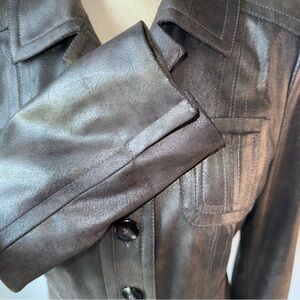 This shimmering dark grey polyester spandex blend jacket from Chico's showcases a sleek, tailored fit and a structured collar. Crafted from high-quality fabric, it offers a classy design that exudes sophistication and style. Dry clean only. Like new.