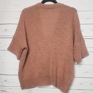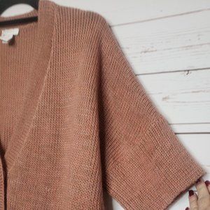 Chico's Crop Wrap Cardigan. Dusty Pink. Single Hidden Snap Closure. Dolman Sleeves. Oversize, Relaxed Fit. Crop Length. Ribbed Trim. Short Sleeve with Ribbed Cuffs. Great Preowned Condition. 54% Wool 46% Acrylic. Chico's Size 3 (Women's Size X-Large) Flat Lay Measurements: Chest 23" Length 25"