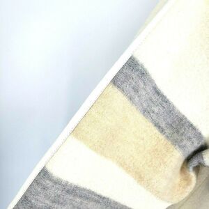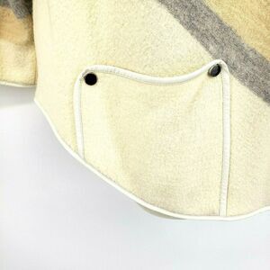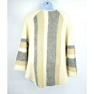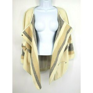 Chico’s 100% Wool Boulce Jacket Blazer Like, Polyester Lining, Gray and tan stripes.Ivory Cream with Cream leather trim and two front lower pockets. Silver Snaps, asymetrical