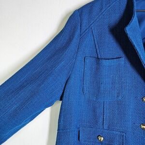 Key features: bold teal blue, lightly lined, gold tone buttons, faux flap pockets, fall weight, woven texture