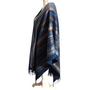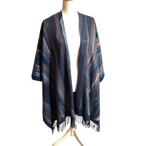 The Chico's Wrap Shawl in blue and tan is a unique bohemian style accessory that fits all sizes. Made from a blend of polyester, rayon, and acrylic, this knit shawl features fringe accents and a soft feel. Perfect for adding a touch of flair to any outfit, this hand wash only garment is sure to stand out with its one-of-a-kind color combination and versatile design.