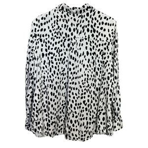 Chic and modern animal print blouse from Chico’s, featuring a black-and-white dalmatian spot pattern. Lightweight woven fabric with a relaxed, flowy fit, collared neckline, button front, and long sleeves with button cuffs. A versatile piece perfect for office wear, layering, or styled casually with denim.