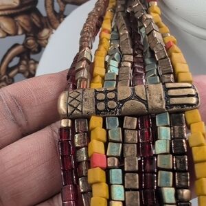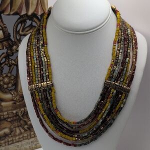 This elegant necklace from Chico's features multiple strands of small, uniform-sized beads in vibrant yellow and red hues. The layered design creates a statement collar style that sits closely around the neck, perfect for adding a touch of sophistication to any outfit.