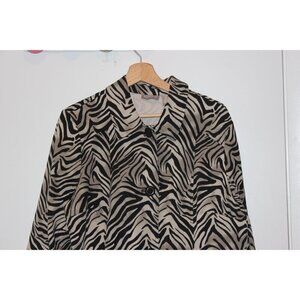 This Chico's zebra print jacket offers a bold, eye-catching design suitable for both casual and professional settings. The button-up style provides a classic touch, while the animal print adds a modern flair. Crafted for comfort and style, it makes a versatile addition to any wardrobe.
