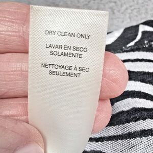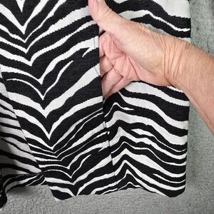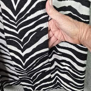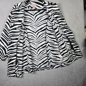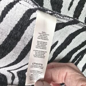 Chico's zebra print knit blazer features open front styling with hidden three-snap closure and two front slit pockets. Lightweight stretchy unlined construction with 20" pit-to-pit and 32" length measurements. Excellent pre-owned condition.