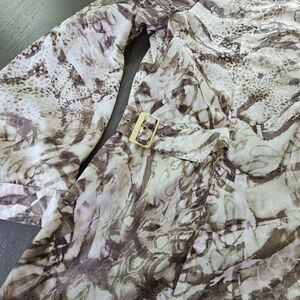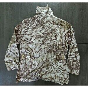 The Chico's Zenergy Animal Print Polyester Zip-Front Windbreaker Rain Jacket in XL size is a stylish mid-length jacket perfect for women. Made from durable polyester material, this jacket features a trendy animal print pattern in a versatile brown color with slight hints of pink. The zip closure and windbreaker style make it practical and fashionable for everyday wear. Side buckle adjustable. Some tarnish on hardwear. See pictures for measurements