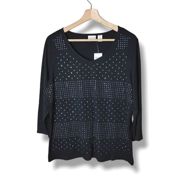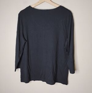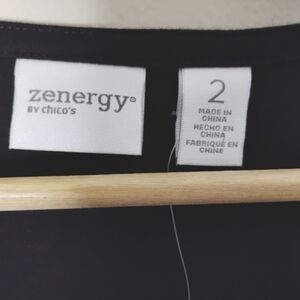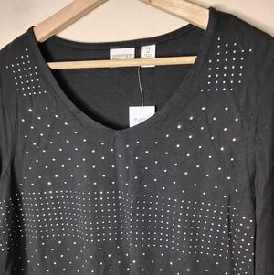 NWT Chico’s Zenergy Erica tunic top in black with tiny sparkle detail. Size Large (Chico’s 2). Soft 60% cotton / 40% modal knit, 3/4 sleeves, tunic length—great for travel, casual dinners, or office-casual layering.