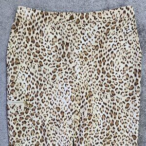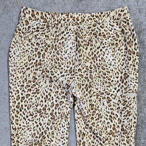 Size Chico's 1 which is size 8. Good used condition, with no stains or tears. Comfortable and lightweight leopard print capris. Has 5 functional pockets including a side zipper pocket. Has adjustable cuffs to create a ruched effect. Zip fly/button closure. Relaxed fit.