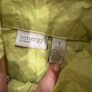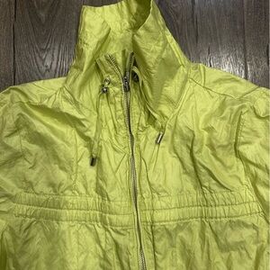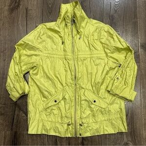 Elevate your activewear game with this lime green windbreaker from Chico's Zenergy line. The mid-length jacket features 3/4 sleeves and a drawstring closure for a comfortable fit. The polyester blend outer shell and unlined interior make it the perfect addition to your spring wardrobe. Pockets provide a convenient place to store your essentials while on the go. The jacket is labeled as a size 1 US M and has a regular fit. Add this stylish piece to your collection for a pop of color during your next workout or outdoor adventure.