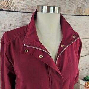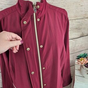 Keywords: Chico's, Zenergygo, Jacket, Burgundy, Snap Front, Long Sleeve, Outerwear, Casual Jacket, Comfortable, Stylish, Mock Neck, Flap Pockets, Gold Hardware