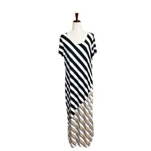 In a cool role reversal, diagonal stripes swap their neutral hues at the hem of this relaxed maxi dress. Black tan and white. What better way to draw attention to your fabulous strappy sandals?