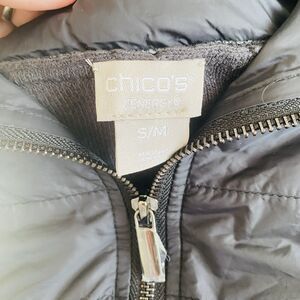 Chicos Zenergy Knit Jacke S-M Brown Espresso Hooded Puffer Trim Short Sleeve Zip