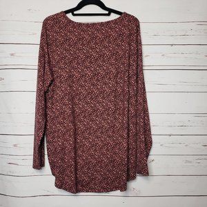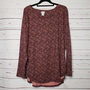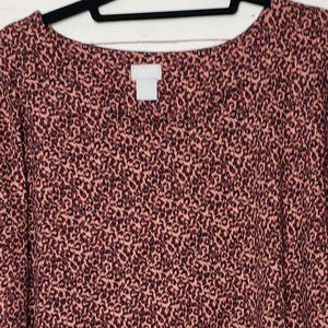 Chico's Zenergy Tee. Rose Pink and Burgundy Leopard Print. Long Sleeve. High Low Hem. Excellent Preowned Condition. 60% Cotton 40% Modal. Chico's Size 3 (16/18). Flat Lay Measurements: Chest 22" Length 29" (front) 31.5" (back)