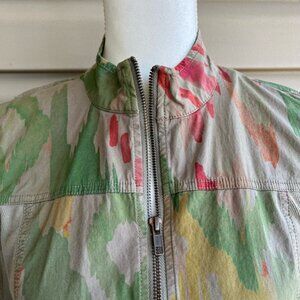 This is a versatile lightweight full zipper jacket from Chico’s Zenergy, ladies size Small (Chico’s size 0). The fabric, 97% cotton/3% spandex, is a light olive green, with a brush stroke IKAT pattern in shades of green, orange, and gold. Features three quarter length sleeves, front pockets with flaps, ribbed knit sides, and full length front zipper with high collar. With its fun, artsy vibe, you’ll find yourself reaching for this jacket often!