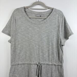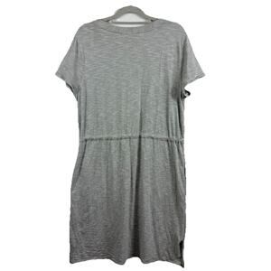 The Chicos Zenergy Olive Green White Stripe Dress is a casual and comfortable knee-length T-shirt dress perfect for travel and everyday wear.