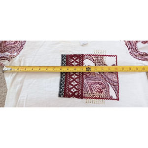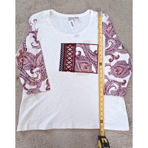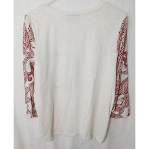 Elevate your casual look with this beautiful Chico's Zenergy top. The red and cream paisley pattern adds a pop of color to your wardrobe, while the embellished front provides a touch of glamour. The cotton blend knit fabric ensures comfort, and the relaxed fit makes this pullover perfect for any occasion.