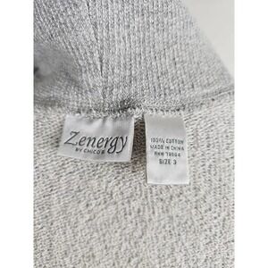 This Chico's Zenergy gray cardigan is the perfect addition to your wardrobe. It features an open front with a tight-knit fabric type, making it great for travel or casual wear during any season. The sweater has 3/4 sleeves and a relaxed fit, complemented by pockets and a solid pattern.