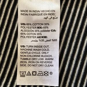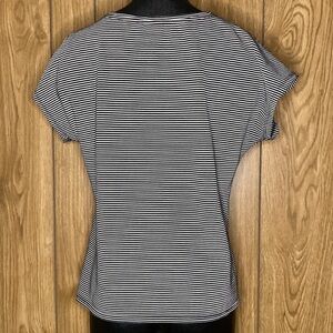 Black & white striped short-sleeve, scoop-neck top from Chico's Zenergy collection. Soft, cotton-blend fabric. Short raglan sleeves. Paisley design. Classic fit with short sleeves and scoop neckline. Excellent preowned condition. No flaws noted.