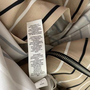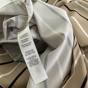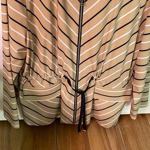 Light weight Chico's cute jacket that zips up the front with drawstring black ties at waist to cinch in. Colors are beige, with black and white stripes. Machine washable and made of polyester-spandex. Measurements pit to pit 22" length 27". Smoke free home.