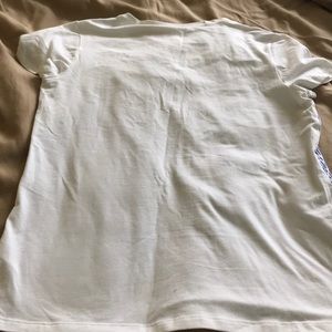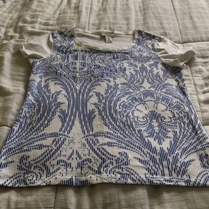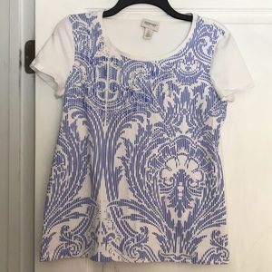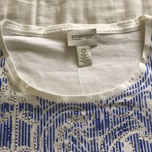 Short sleeve White & Blue Chico’s Zenergy T-shirt with silver & blue stones. Very comfortable and lightweight for the summer. Pair with shorts or jeans. From a smoke and pet free home. Gently used.