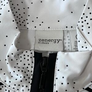 Elevate your style with Chico's Zenergy polka dot vest featuring rhinestones for a touch of sparkle. Crafted from a polyester blend, this versatile vest offers comfort and elegance.