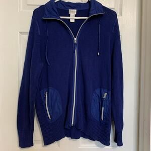 Beautiful blue zip up with zipper pockets. Collar with drawstrings. Cotton/rayon blend. Half of the tag is detached, otherwise good used condition.