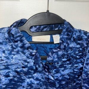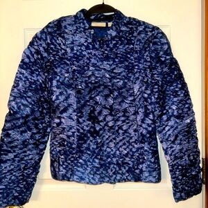 Chico’s Zip Front Jacket Blue Print Ruched Detail, Size 2