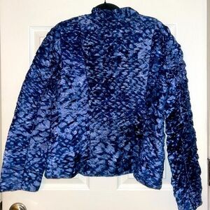 This Chico’s size 2 zip-front jacquard jacket in a rich blue hue combines elegance with a touch of texture. The all-over ruching adds a flattering, dynamic effect, creating a feminine silhouette that drapes beautifully. Crafted from a jacquard fabric, it offers a subtle pattern that elevates the classic zip-front design. Perfect for layering, this jacket is ideal for both casual and dressy occasions, providing versatile style and comfort.