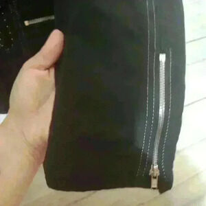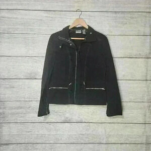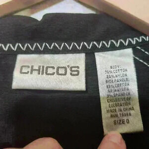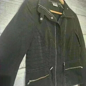 Chicos zip up thin jacket in a size 0. Equals to an XS. Black with some minor bleach stains on the cuff of one sleeve. No other defects. No rips. Smoke free home.