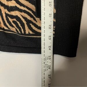 Chico’s Zynergy leopard sweater zip up jacket with pockets. Black side ribbing for more stretch. Trimmed in black with main base of jacket in a brown black and tan leopard print. Great layering piece for Fall and Winter! Size 1 (8 M)