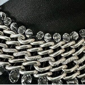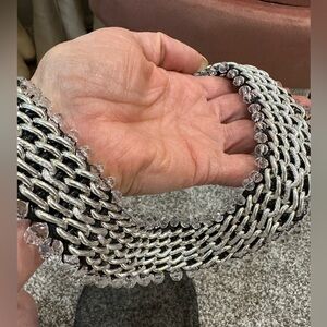 Lovely woven, black and silver tone collar necklace by Chicos. It’s embellished around that outside with faux crystal beads. In excellent like new condition.