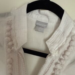 Chico's size 2 see chart attached. Lots of pom poms on the sleeves and down the front. Fringe around the back at the neck mandarin collar. There may be a few missing pom pots so I discounted the asking price. Pit to pit 22.5". Fabric Content 51% linen, 49% cotton.