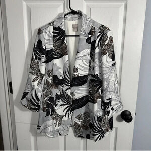 Stunning piece by Chico's. Size 2 (Chico's sizing) animal/tropical print open front cardigan or light jacket. Black/white/gray, with some cheetah print in brown. Fully lined, 3/4 sleeve. Perfect for parties, the office, cruises, holidays!
