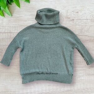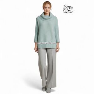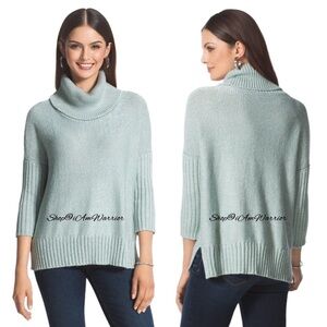 Chicoโs slouchy cowl neck sweater with fitted 3/4 sleeves in a lovely shade of pale aqua is perfect for causal wear all year round. A touch of shimmer adds to the elegance of this pretty sweater. GUC. Chicโs size 0 equates to a ladies size small. Oversized relaxed fit could easily accommodate a medium, depending on your fit preferences.