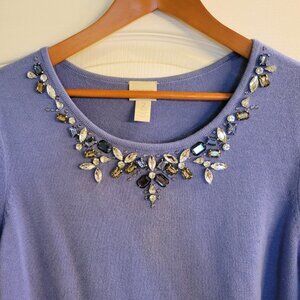 Gorgeous beading detail around the neckline, in perfect shape! This Chico's top is comfortable and so fun to wear. Goes with just about anything! It has some piling and a tiny spot near the front lower hem. I always get nice comments on this! 60% cotton, 20% rayon, 20% nylon. Washable.