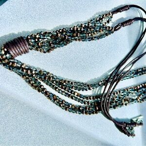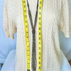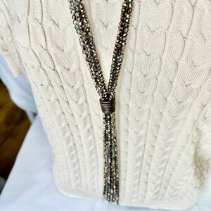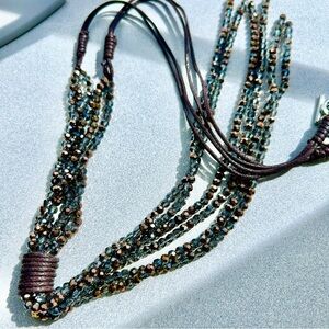 Beautiful Chico's lariat-style necklace featuring multiple strands of metallic beads in bronze, silver, and gold tones. The necklace has a lovely wrap design with a decorative metal connector that creates an elegant drape. Perfect for dressing up a casual outfit or adding sophistication to your look!