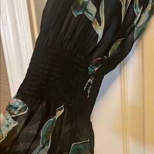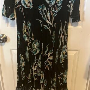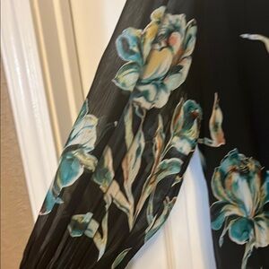 This elegant sundress by Chico's features a flowing silhouette with long bishop sleeves and a crew neckline, perfect for wedding occasions. The silver and green floral pattern adds a touch of sophistication, making it ideal for cocktail events. Its relaxed fit and soft sheen fabric ensure comfort and style.