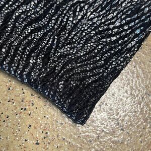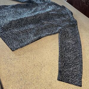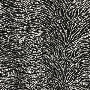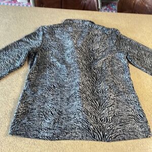 Chico's black and silver metallic tiger print asymmetrical zip front jacket. Features a light stretchy textured fabric with a silver metallic allover tiger print, asymmetrical zipper closure, side pockets. Shows light signs of wear - some of the silver finish is rubbing off around the sleeve/cuff edges (see last two pics). Chico's size 1 is equivalent to M/8 according to Chico's website - see pics for measurements.
