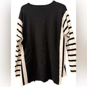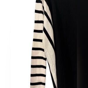 The Chico's blouse in size 1 US medium is a stylish and versatile piece perfect for both party/cocktail and casual occasions. This black and white striped blouse features stripes on the side and sleeves. long sleeves, a round neck, and a pullover blouse. Made from a blend of polyester and rayon, this blouse offers a regular fit and is designed for women who wear a size medium in the US. The classic yet trendy style of this blouse makes it a great addition to any wardrobe, suitable for wearing during the summer, fall, or spring seasons. Comes from smoke free home. Teacher, office top, work top, library, retro, boho, rock