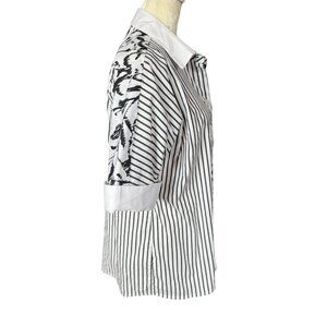 Women's Chico's black and white striped and floral short sleeve collared button down shirt, size 1. This has cuffed white sleeves. Excellent like new condition and from a smoke free pet free home. Quick shipper!