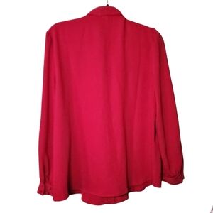 Beautiful red blouse by Chico's size 2 which converts to a medium. I do think this fits a little more like a large. Ruffle front, 100% polyester. Velvet along the collar. Buttons down the front and on the cuffs of the sleeves, see pics. Like new condition. About 28 inches in length from the top of the collar to the base of the blouse. Sleeves are about 25 inches in length. About 22 inches pit to pit. Perfect blouse for a holiday party. Nice staple piece to pair with slacks and a blazer.
