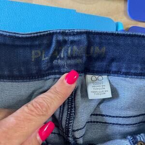 Chico’s Platinum Denim blue jeans women’s vanity size 00 which matches regular size 2 but the measurements of these are more like a 4 or 6 – see measurements - dark wash stretchy Picture of material tag and care instructions included in listing.