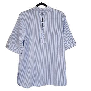 Chico's blue & white striped short sleeve button up top criss cross lace back in excellent condition 44" bust 31" long