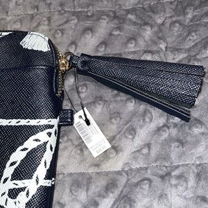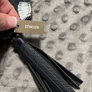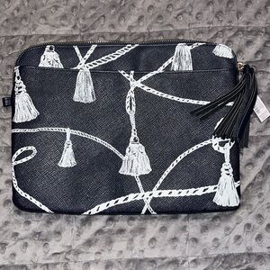 Chico’s blue white tassel print tech bag cosmetic pouch navy blue zip close NWT