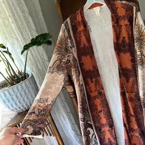 Chico’s brown graphic cardigan duster sweater 2 M/L Like new