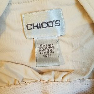 Nude colored, form-fitting camisole for wearing underneath sheer clothing. Comfortable and stretchy. Size 1 in Chicos is a medium. (See their website for sizing. www.chicos.com) Like most things in my closet, they are gently worn with zero to minimum signs of visual wear. Measurements: bust: 16.5" across, length from front neckline to hem: 16". Please ask questions before purchasing. Thank you for your liked and shares!