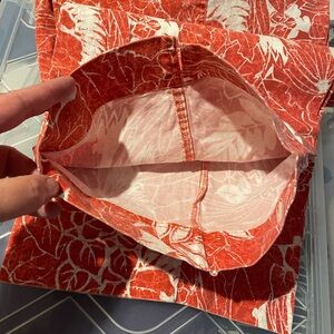 Chico’s capri pants with pockets. Deep coral/white tropical pattern. Elastic in back waistband. Please note one back pocket is missing a button.
