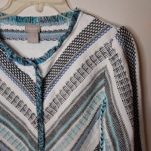 chico's tweed cardigan/jacket with fringe detail, snap button and side pockets