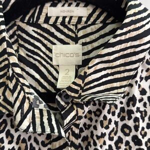 Excellent condition and no signs of wear. Introducing a stylish and versatile Chico's top in a trendy cheetah and zebra print. This button-up shirt features a collared neckline and 3/4 split cuff sleeves, making it a perfect choice for casual, business, or travel occasions. The shirt is made from a lightweight and breathable cotton material that is machine washable and does not require ironing, making it an easy and convenient addition to your wardrobe. From armpit to armpit is about 22 inches and 27 inches long.